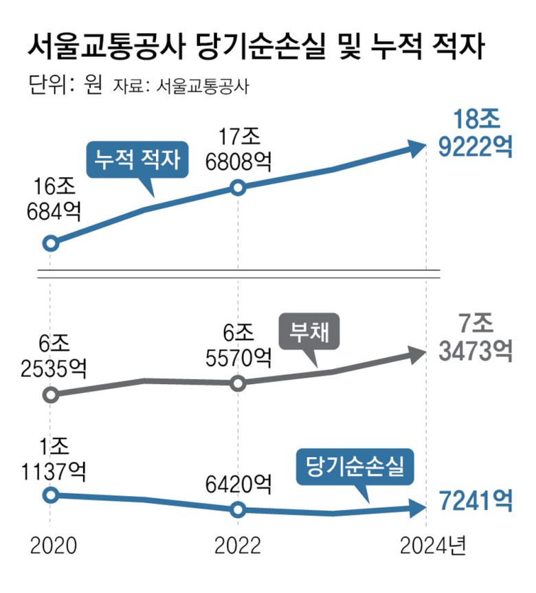 이런 가운데 물가 상승, 인건비 증가, 승객 수요 변화, 코로나19 여파 등이 겹치면서 철도 적자는 눈덩이처럼 불어나고 있다. 서울시에 따르면 공사의 지난해 말 기준 당기순손실은 전년보다 40% 증가한 7241억 원, 누적 적자는 18조9000억여 원에 달한다. 부채는 7조3473억 원으로, 하루 이자만 3억 원이다.