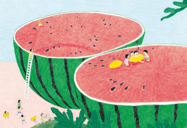 무더운 여름, 수박씨가 빠진 자리에 고인 물이 시원한 수영장이 되는 상상에서 출발한 그림책 ‘수박 수영장’.
