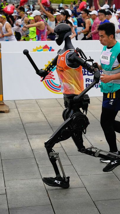 19일 중국 베이징에서 20여 대의 인간형 휴머노이드 로봇이 참가한 21.0975㎞ 코스의 하프 마라톤 대회가 개최됐다. 베이징 휴머노이드 혁신 센터가 개발한 ‘톈궁(天工) 울트라’가 2시간 40분 42초의 기록으로 1위를 차지했다. 옆 레인에서 달린 남성 우승자는 1시간 2분 36초를 기록했다.