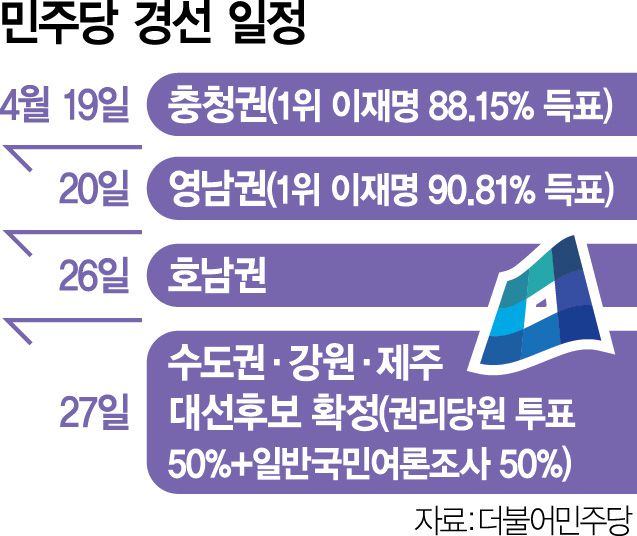 한편 민주당은 호남권(26일), 수도권·강원·제주(27일) 순회 경선을 마지막으로 권리당원 투표 50%와 국민 여론조사 50%를 합산해 27일 대선 후보를 확정하게 된다.