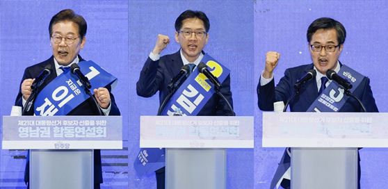 세 후보는 전날 충북 청주체육관 열린 첫 순회 경선에서 국회·대통령실 세종 이전 등 1순위 공약으로 ‘행정수도 완성’을 제시했다. 양 김 후보가 충청에 이어 영남 표심을 구애했지만 이재명 대세론을 넘기에는 역부족이었다. 이미 이 후보는 지지율을 끌어올리며 본선 대비에 나선 상태다. 앞서 18일 발표한 4월 3주 차(15~17일) 한국갤럽 조사에서는 38%를 기록해 해당 정례 조사 기준 자신의 역대 최고치 지지율(37%)을 한 주 만에 돌파했다. 이날 발표된 한국사회여론연구소(KSOI) 여론조사에서도 이 후보는 46.1%로 상승세를 이어갔다.
