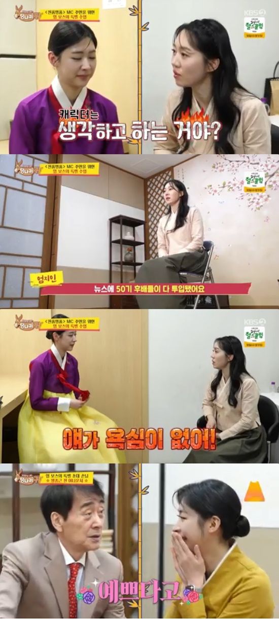 엄지인은 이번 봄 개편에서 50기 신입들이 뉴스에 다 투입된 사실을 전하면서 홍주연을 두고 "후배들이 치고 올라오는데 애가 욕심이 없다"고 걱정했다.