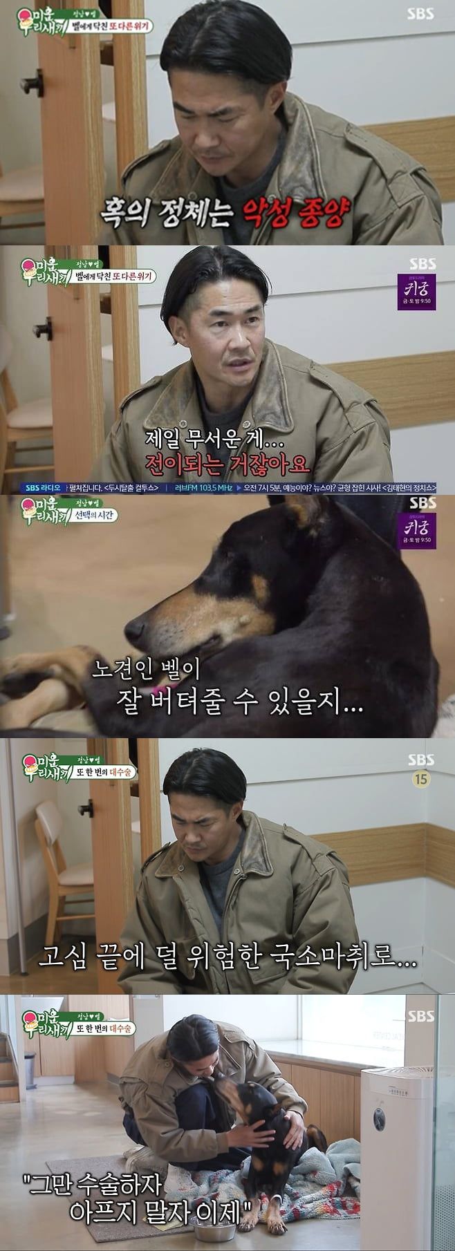다만 국소 마취로 수술하면 쇼크사는 피할 수 있다고. 고민에 빠진 배정남은 위험성이 낮은 국소 마취로 진행하기로 했다. 수술 후 수의사는 벨의 몸에서 떼어낸 암 덩어리 사진을 보여주며 "조직검사 보내봐야 아는데 종양은 완전히 긁어낸 것 같다"고 말했다. 한숨을 돌린 배정남은 벨을 안으며 "할매 수술 그만, 앞으로 아프지 말자, 사랑해"라고 말했다.