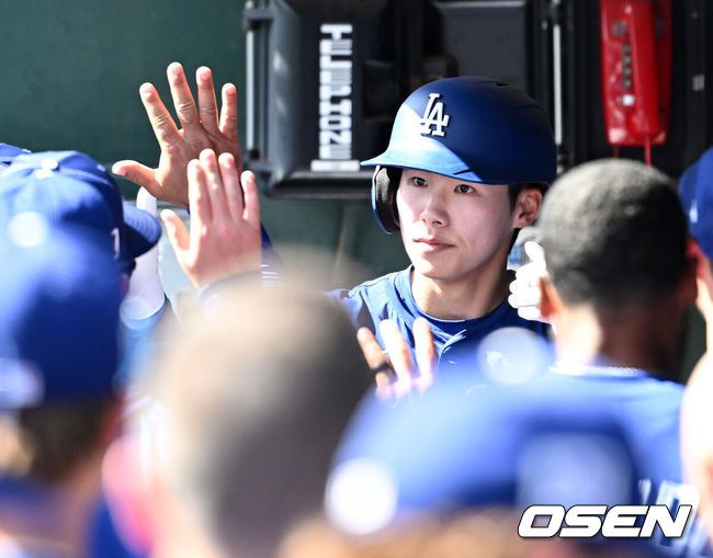 [OSEN=글렌데일(미국), 이대선 기자] '코리안 데이'였다.이정후(샌프란시스코 자이언츠)와 김혜성(LA 다저스)이 맞대결에서 나란히 맹활약했다. LA 다저스와 샌프란시스코 자이언츠는 2일(이하 한국시간) 미국 애리조나주 글렌데일의 캐멀백 랜치에서 2025 메이저리그 시범경기를 치렀다.이날 김혜성은 8번 유격수로,이정후는 3번 중견수로 각각 선발 출장했다. 이정후가 총알 2루타로 선제 타점을 올리자, 7푼 타율로 마음고생을 하던 김혜성은 시범경기 첫 홈런포를 터뜨렸다.3회말 1사에서 LA 다저스 락우드-파웰의 적시 2루타 때 1루주자 김혜성이 득점 후 더그아웃에서 환호하고 있다. 2025.03.02 / sunday@osen.co.kr