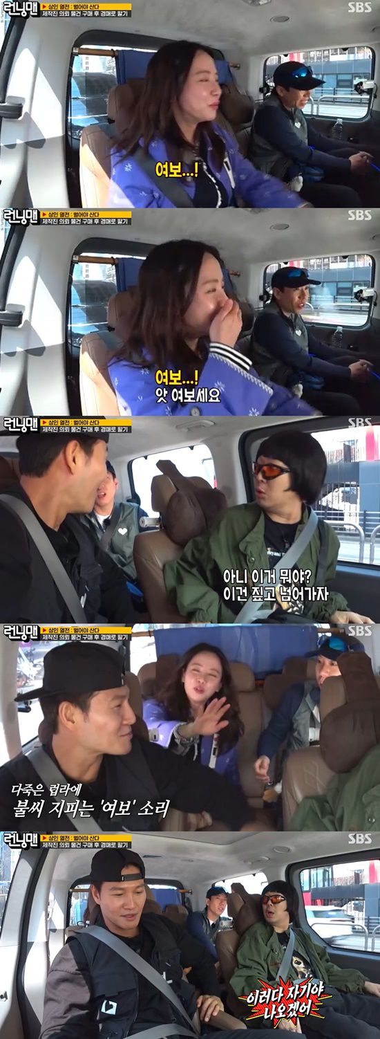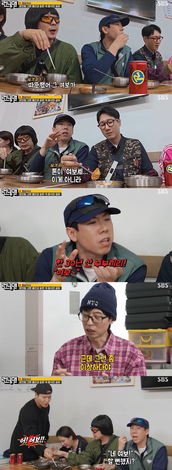 송지효가 실수였다고 말하기도 채 목격자인 하하는 "그 여보가 따뜻했다"고 끼어들었고, 양세찬 역시 "톤이 '여보세...'이게 아니라 '여보'였다. 30년 산 부부끼리 하는 '여보' 같았다"고 거들었다.