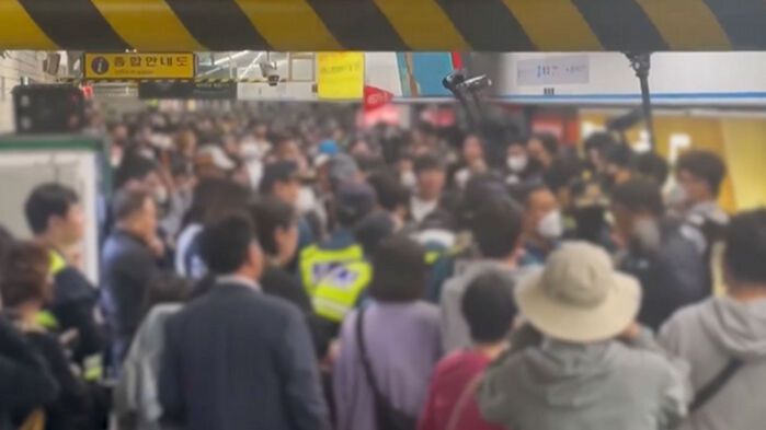 이 과정에서 승강장을 떠나려던 지하철도 문이 제대로 닫히지 않아 출발이 지연되고 있습니다.