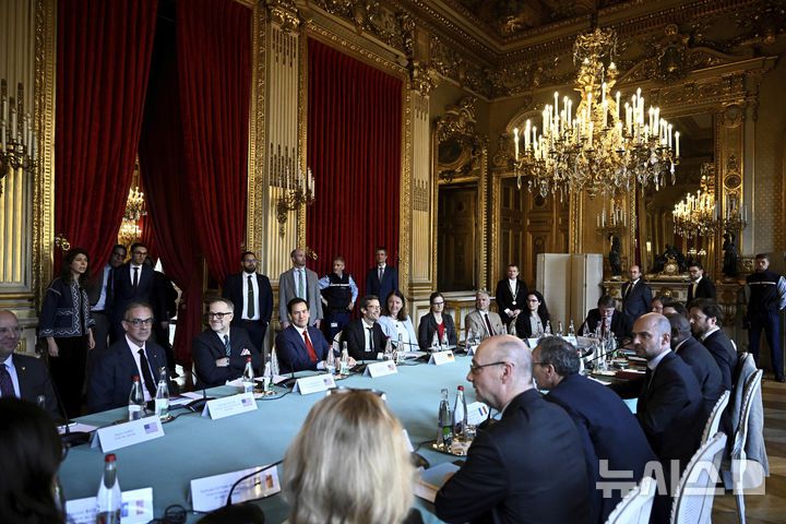 [파리=AP/뉴시스]미국이 우크라이나 종전을 위해 러시아의 크림반도 합병 인정, 우크라이나의 북대서양조약기구(NATO·나토) 가입 배제를 포함한 입장을 유럽과 우크라이나에 전달했다고 월스트리트저널(WSJ)이 보도했다. 사진은 마코 루비오 미 국무장관(왼쪽 가운중앙)과 장-노엘 바로 프랑스 외무장관(오른쪽)이 17일(현지시각) 파리에서 우크라이나와 우크라이나 안보에 관한 고위급 회의에 참석한 모습. 2025.04.18.