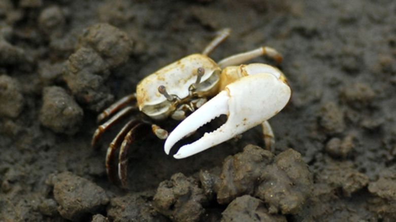 흰발농게는 국내 서해안과 남해안 갯벌에 드물게 서식하며 수컷의 경우 한쪽 집게다리가 유난히 크고 하얀 게 특징입니다.