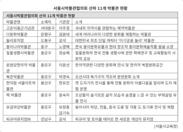 이를위해 오는 23일 서울시교육청에서 서울시박물관 협의회 및 11개 박물관과 업무협약을 체결한다. 참여 박물관은 고촌이종근기념관, 다문화박물관, 둘리뮤지엄, 북촌박물관, 떡박물관, 유금와당박물관, 종이나라박물관, 짚풀생활사박물관, 춘원당한의약박물관, 피규어뮤지엄W, 한익환서울아트박물관 등 11개 기관이다.