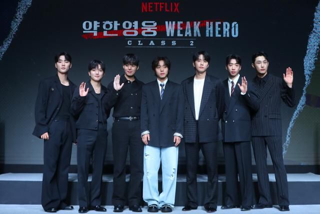 배우 이민재(왼쪽부터), 최민영, 려운, 박지훈, 이준영, 유수빈, 배나라가 21일 오전 서울 마포구 호텔 나루에서 열린 넷플릭스 시리즈 '약한영웅 Class 2' 제작발표회에서 포즈를 취하고 있다. 뉴시스 |