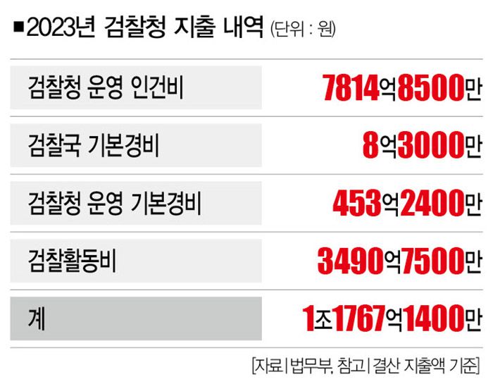 검찰청의 한해 예산은 1조원이 좀 넘는 수준이다. 2023년 지출액(가장 최근의 결산 자료) 기준으로 검찰청 총 예산은 1조1767억1400만원이었다. 이 가운데 검찰청 운영 인건비 7814억8500만원, 검찰국 기본경비가 8억3000만원, 검찰청 운영 기본경비가 453억2400만원, 검찰활동비가 3490억7500만원을 차지했다. 여기서 인건비와 기본경비를 뺀 검찰활동비는 실질적인 검찰의 예산사업에 사용하는 돈이다.