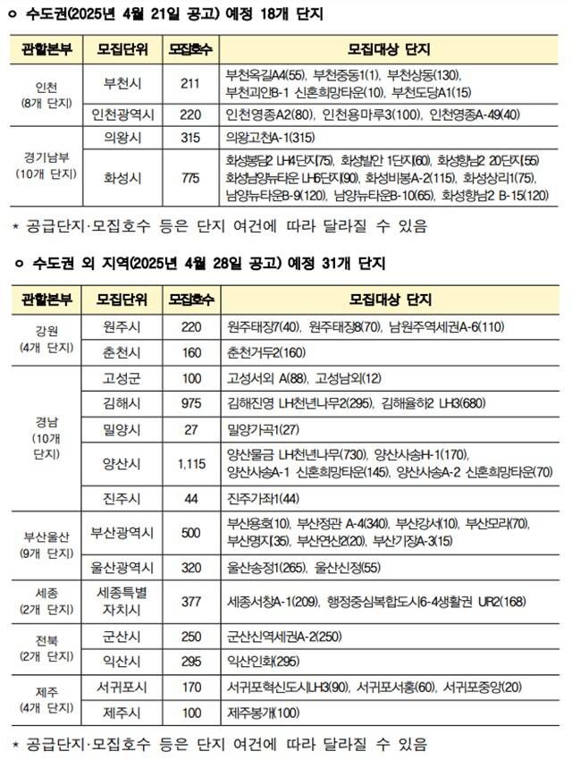 지역별로는 수도권에서 의왕고천 등 18개 단지 1521가구 입주자를 모집한다. 비수도권은 양산물금 등 31개 단지 4653가구다. 수도권 지역은 21일부터, 비수도권은 28일부터 단지별 공고가 순차 게시된다. 공급물량은 단지별 여건에 따라 일부 변경될 수 있다.