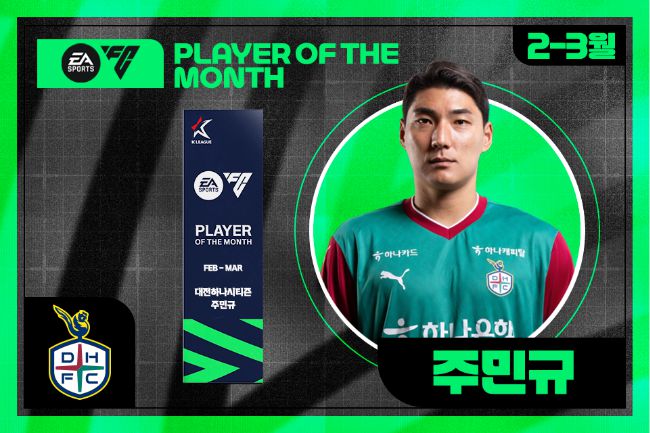 대전하나시티즌 주민규가 K리그 공식 비디오게임 파트너 일렉트로닉아츠(Electronic Arts, 이하 ‘EA’)가 후원하는 2025년 첫 ‘EA SPORTS 이달의선수상(EA SPORTS Player Of The Month)’을 수상했다.