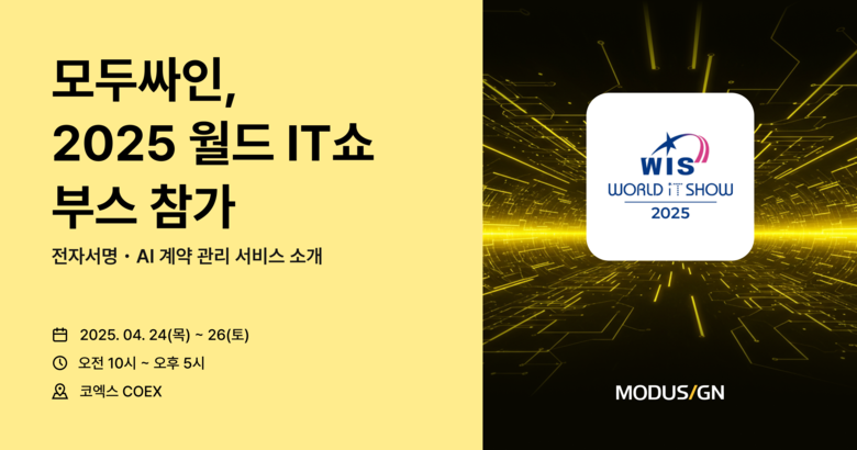 ㈜모두싸인은 오는 4월 24일부터 26일까지 서울 코엑스에서 열리는 ‘2025 월드 IT쇼’에 참가해 기업 및 공공기관의 디지털 전환을 지원하는 전자서명 및 AI 기반 계약 관리 솔루션을 선보인다고 21일 밝혔다.