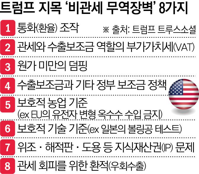 트럼프가 언급한 ‘비관세 부정행위’는 △통화(환율) 조작 △부가가치세 △덤핑 무역 △정부 보조금 △보호적 농업 기준 △보호적 기술 기준 △지식재산권 침해 △관세 회피를 위한 환적(우회수출) 등이다. 보호적 농업 기준 사례로는 유럽연합(EU)의 ‘유전자 조작 옥수수’에 대한 수입 금지, 기술 사례로는 일본의 볼링공 테스트 등을 제시했다.