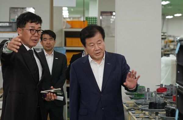 강석진 (오른쪽)중진공 이사장이 미국관세 피해기업인 오디에이테크 사업장을 둘러보고있다.(출처 =중진공) |