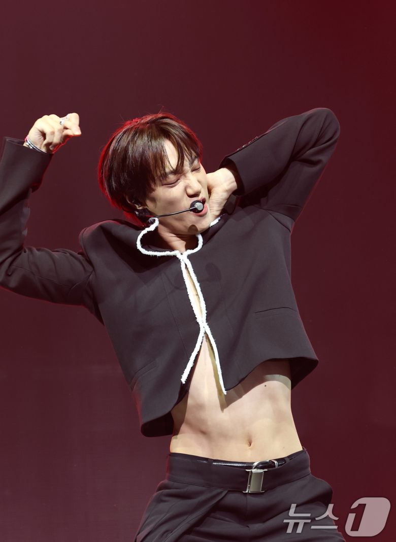 엑소 카이가 21일 서울 광장동 예스24 라이브홀에서 가진 네 번째 미니앨범 '웨이트 온 미(Wait On Me)' 발매 쇼케이스에 참석해 타이틀 곡 '웨이트 온 미’를 열창하고 있다. 2025.4.21/뉴스1 ⓒ News1 권현진 기자