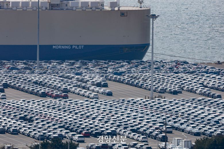 지난달 31일 경기 평택시 평택항 자동차전용부두에 선적을 앞둔 수출용 차량들이 세워져 있다. 문재원 기자