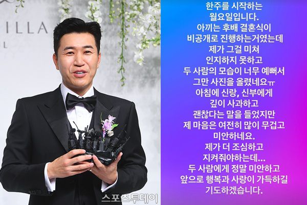 때문에 결혼식에 참석한 같은 코요테 멤버 신지도 "신부님 얼굴은 지켜주는 걸로"라며 김종민 아내 얼굴만 스티커로 가린 채 올려 눈길을 끌었다.