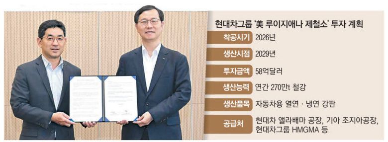 현대제철이 2029년까지 루이지애나에 건설하려는 연산 270만t 규모의 전기로 제철소에 포스코가 공동 투자하기로 했다. 제철소 건설을 위한 투자금액은 총 58억달러(약 8조2000억원)다. 현대차는 이 중 절반을 외부 투자로 충당할 계획이다. 포스코는 지분투자 시 미국의 25% 철강 관세 압박에서 벗어날 수 있는 현지 생산기지를 간접적으로 확보하게 된다.