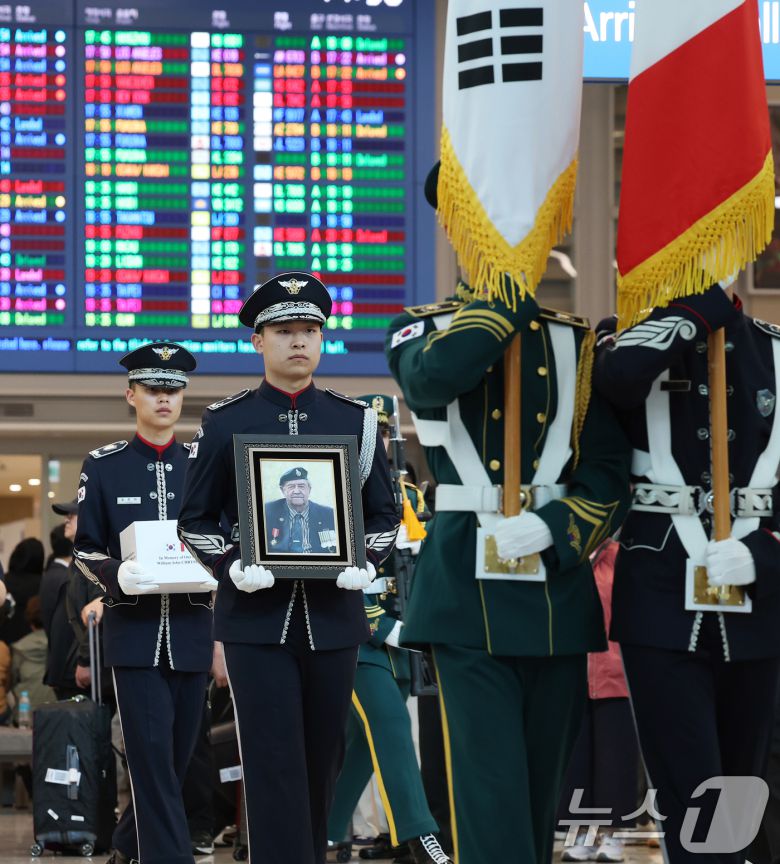 (인천공항=뉴스1) 오대일 기자 = 21일 오후 인천국제공항 2터미널 입국장에서 캐나다 참전용사 윌리엄 크라이슬러 유해 봉환식이 거행되고 있다. 크라이슬러 참전용사는 1950년 8월 캐나다 경보병연대 제2대대 소속 이병으로 6·25전쟁에 참전해 가평전투 등에서 활약했다. 그가 가평전투 직후 부상당한 동료를 부축하면서 이동하는 모습의 빛바랜 사진은 전쟁의 참상을 보여주는 장면으로 남아 있다. 2025.4.21/뉴스1
