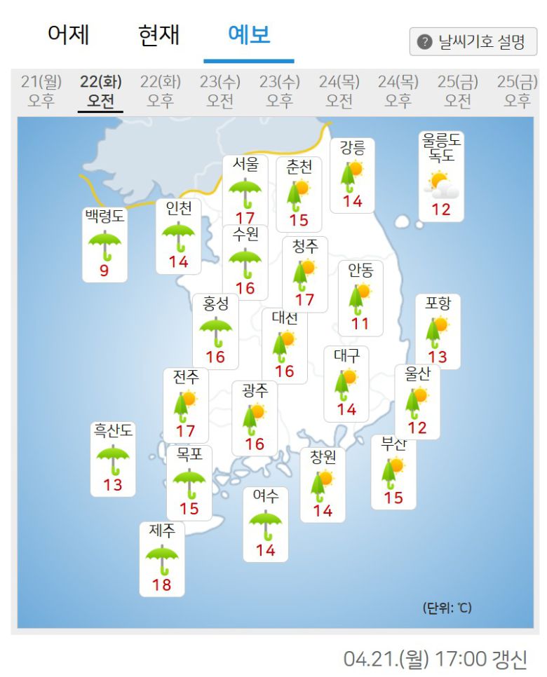 또 전국이 대체로 흐리겠다. 기온은 아침기온이 평년(최저 5~11도, 최고 17~22도)보다 2~6도가량 높겠고, 낮 기온은 평년과 비슷하거나 조금 높겠다. 아침최저기온은 11~17도, 낮최고기온은 16~21도가 되겠다.