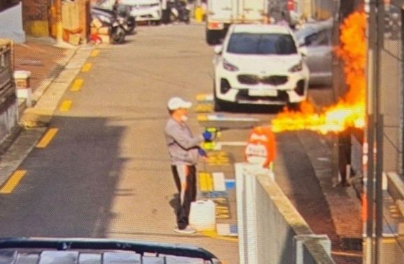 21일 오전 서울 관악구 봉천동의 한 아파트에서 ‘분무식 농약 살포기’를 이용한 방화로 불이 나 용의자인 60대 남성이 사망하고, 아파트 4층 주민 등 6명이 다쳤다. 용의자가 이날 오전 봉천동의 한 빌라 앞에서 분무식 농약 살포기로 불을 지르고 있다. 뉴스1
