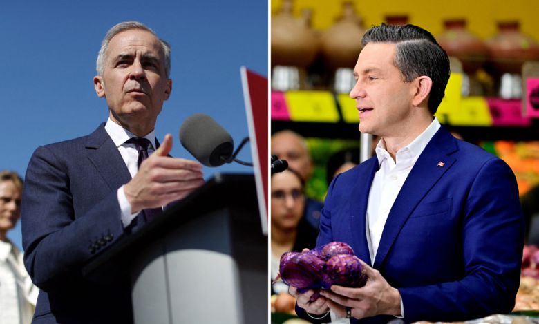 마크 카니 캐나다 총리가 20일(현지시간) 온타리오주 오타와의 네핀 선거구에서 열린 유세에서 연설하고 있다(왼쪽 사진). 집권 자유당에 도전하는 보수당의 피에르 폴리에브 대표는 이날 브리티시컬럼비아주 서리의 한 식료품 가게에서 선거운동을 하고 있다. AFP·로이터연합뉴스 |