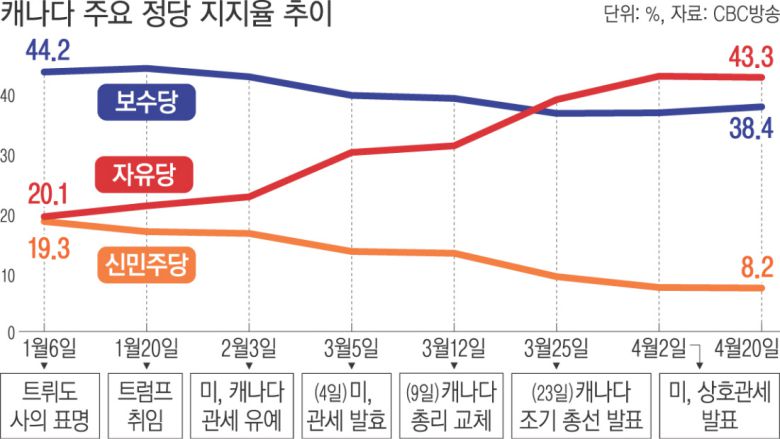 도널드 트럼프 미국 대통령이 시작한 관세전쟁의 첫 타깃이었던 캐나다가 오는 28일(현지시간) 조기 총선을 치르고 무역, 경제, 안보 등 의제에 대응할 차기 총리를 선출한다. 캐나다 언론이 이번 선거를 ‘트럼프가 장악한 총선’이라고 부를 정도로 미·캐나다 관계가 총선 승패를 가를 쟁점으로 부상했다. 여론조사에선 마크 카니 총리가 이끄는 집권 자유당이 선두를 달리고 있다.