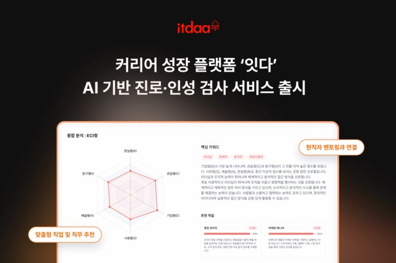 커리어 성장 플랫폼 잇다(itdaa)를 운영하는 레디앤스타트가 AI 기술을 기반으로 한 개인 맞춤형 진로·인성 검사 서비스를 정식 출시했다.