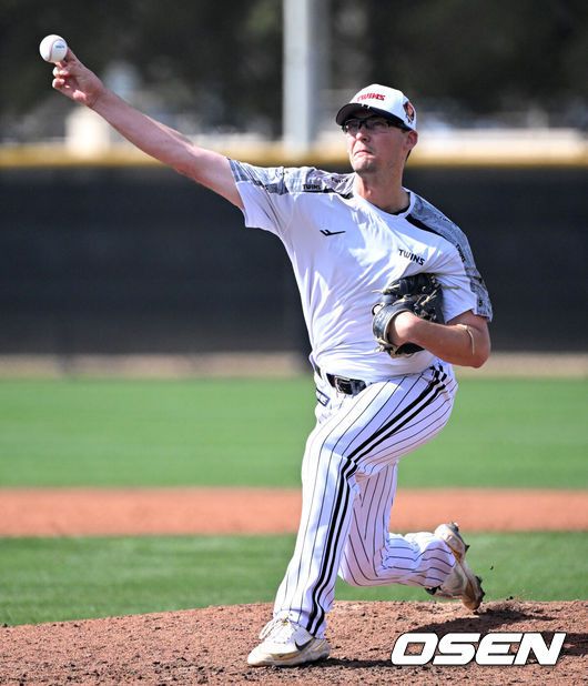 [OSEN=애리조나(미국), 이대선 기자] 20일(한국시간) 미국 애리조나주 스코츠데일 인디언스쿨 파크 베이스볼필드에서 LG 트윈스의 청백전이 진행됐다. LG 캠프 초청선수 코엔 윈이 역투하고 있다. 2025.02.20 / sunday@osen.co.kr |