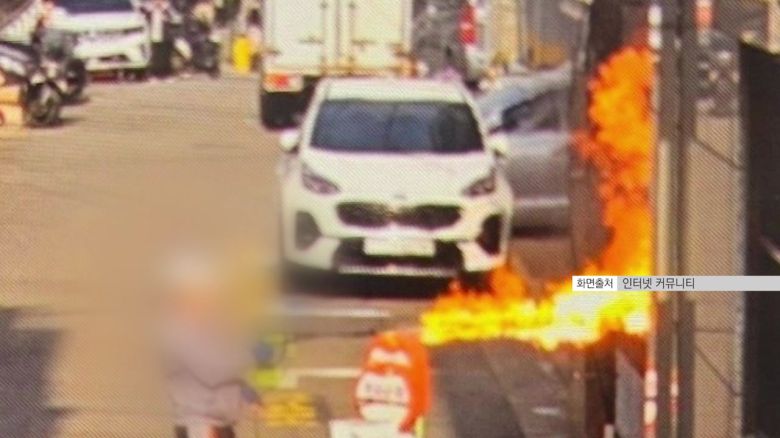 쓰러진 통은 시뻘건 불길에 휩싸여 있는데, 바로 뒤 담벼락도 그을렸습니다.
