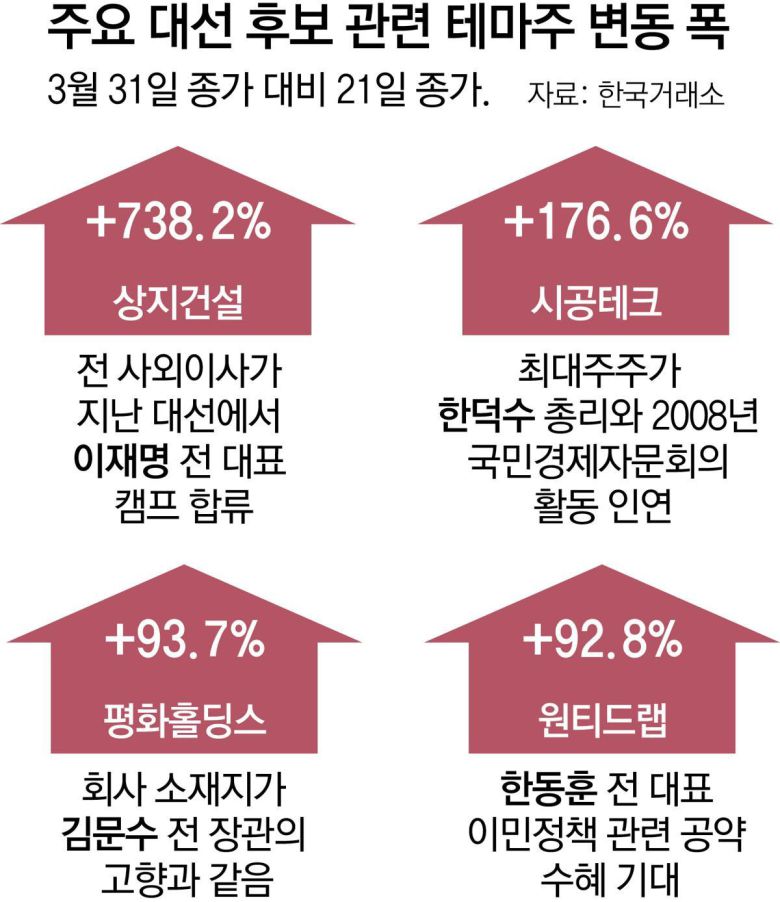 최근 한덕수 국무총리의 대선 출마 가능성이 주목받으면서 시공테크 등 테마주가 상한가를 기록하기도 했다. 4일 헌법재판소의 탄핵심판을 전후로 김문수 전 고용노동부 장관의 테마주로 분류된 평화홀딩스는 3거래일 연속, 한동훈 전 국민의힘 대표 테마주로 여겨지는 원티드랩은 2거래일 연속 상한가를 쳤다. 안철수 국민의힘 의원이 창업한 안랩도 2거래일 연속 20%대 상승했다. 다만 이후 지지율 변화 등에 따라 10% 이상씩 급락하거나 다시 급등하는 일이 반복되고 있다.