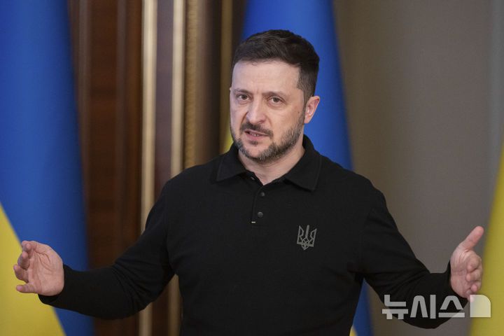[키이우=AP/뉴시스] 볼로디미르 젤렌스키 우크라이나 대통령이 지난 17일(현지 시간) 우크라이나 키이우에서 기자회견하고 있다. 2025.04.22.