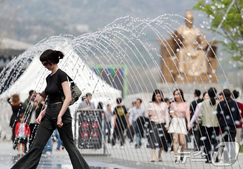 서울의 낮 최고기온이 25도를 기록하는 등 초여름 날씨를 보인 17일 오후 서울 종로구 광화문광장에서 시민과 관광객들이 가벼운 옷차림으로 점심 산책을 하고 있다. 기상청은 당분간 따뜻하지만, 일교차가 큰 봄 날씨가 이어질 것으로 내다보고 있다. 2025.4.17/뉴스1 ⓒ News1 오대일 기자 |
