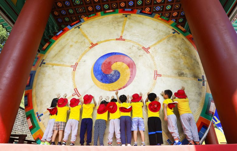 세계에서 가장 큰북 영동 천고. 어린이들이 타북체험을 하고 있다. 충북 영동은 조선의 문신이자 음악가 박연의 고향이다. |