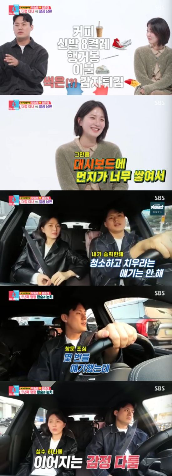 그리고 출근을 위해 차에 탄 엄준태는 인상을 찌푸렸다. 출장간 사이 차를 사용한 박승희의 흔적이 고스란히 남아있던 것. 엄준태는 "승희가 쓰면 차가 지저분해 질 것을 알았다. 그래서 일부러 일찍 차에 갔다. 역시나 지저분하더라"고 했다.