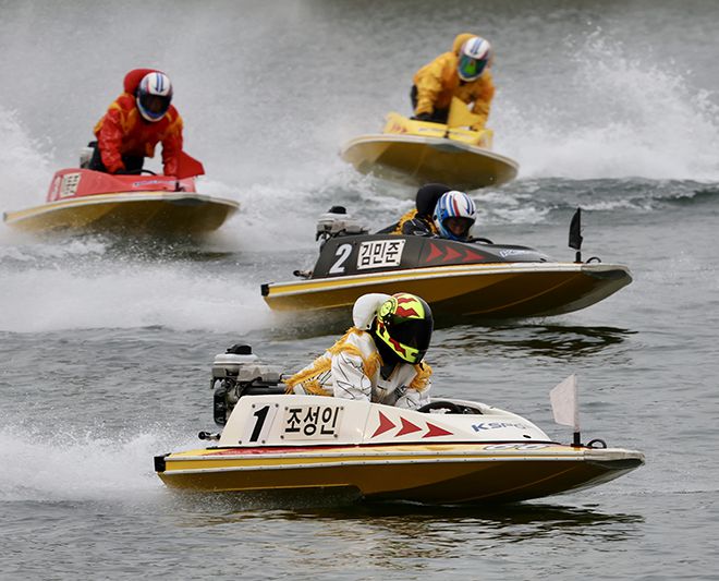 4월17일 2025 스피드온배 대상 경정에서 조성인, 김민준, 이동준이 차례로 결승선을 향해 질주하고 있다. 사진=서울올림픽기념국민체육진흥공단 경륜경정총괄본부 제공 |