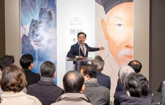 '아! 금강산, 수수만년 아름다운' 특별전이 이달 22일부터 6월 25일까지 강서구 겸재정선미술관에서 열린다. 진교훈 강서구청장이 지난 1월 겸재정선미술관에서 열린 기획 전시 '전신과 진경' 개막식에서 인사말을 하고 있다. 강서구 제공. |