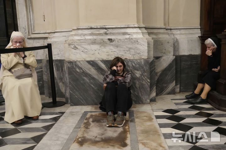 [로마=AP/뉴시스] 21일(현지 시간) 이탈리아 로마의 성 요한 라테라노 대성당에서 열린 고(故) 프란치스코 교황을 위한 미사에 참석한 신자들이 침통한 모습으로 앉아 있다. 2025.04.22.