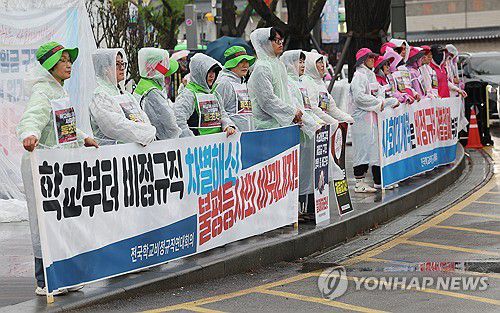 (서울=연합뉴스) 김성민 기자 = 민주노총 전국학교비정규직노동조합(학비노조) 등으로 구성된 '전국학교비정규직연대회의'가 22일 서울 종로구 정부서울청사 앞에서 연 조리실무사 처우 개선 촉구 단식 농성에서 참가자들이 현수막을 들고 있다. 2025.4.22