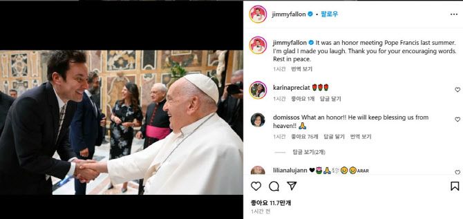 지미 팰런 "지난 여름 교황 만나 영광, 편히 잠드시길"