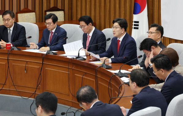국민의힘 권성동 원내대표(왼쪽 네번째)가 22일 국회에서 열린 원내대책회의에서 발언하고 있다. 2025.4.22 |