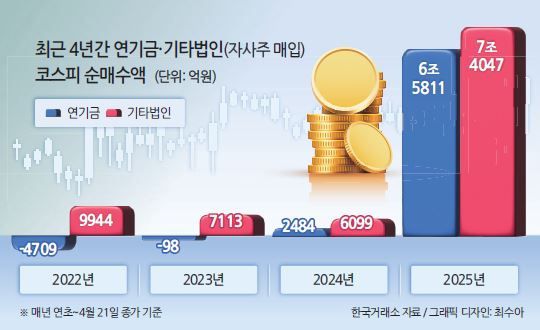 주요 기업의 자사주 취득 결과가 담긴 ‘기타법인’ 순매수액은 올해만 전날 종가까지 7조4047억원을 기록했다. 기존 동기간 역대 최대치인 지난 2020년(2조5435억원)과 비교했을 때 약 3배에 이르는 수준이다.
