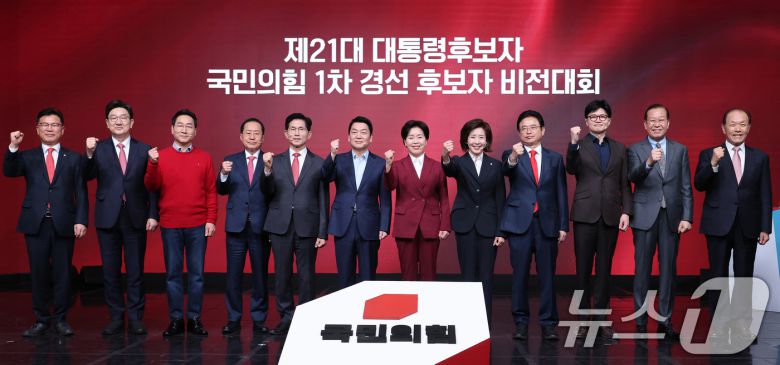 18일 오후 서울 강서구 ASSA아트홀에서 열린 '제21대 대통령후보자 국민의힘 1차 경선 후보자 비전대회' 에 참석한 후보들이 당지도부와 기념 촬영을 하고 있다. 왼쪽부터 이양수 사무총장, 권성동 원내대표, 유정복, 홍준표, 김문수, 안철수, 양향자, 나경원, 이철우, 한동훈 후보, 권영세 비대위원장, 황우여 선거관리위원장. (공동취재) 2025.4.18/뉴스1 ⓒ News1 이재명 기자 |