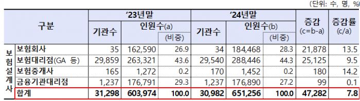 지난해 국내 보험 설계사 수가 전년 60만4000명에서 4만7000명(7.8%) 증가한 65만1000명으로 나타났다. 같은 기간 설계사 1인당 월평균 소득도 338만원으로 전년 304만원보다 늘었다.