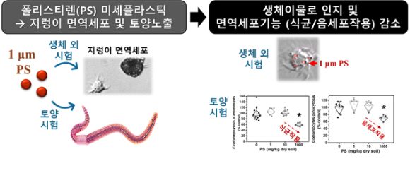 연구팀은 국내 서식종인 붉은줄 지렁이를 대상으로 1μm(마이크로미터) 폴리스티렌(polystyrene) 미세플라스틱에 노출될 경우, 면역세포 식균작용과 음세포작용 변화가 어떻게 일어나는지를 확인했다.