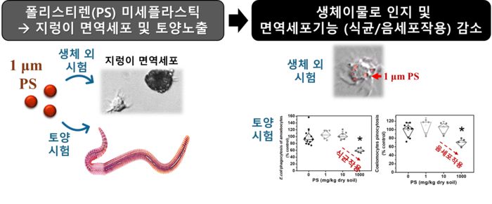 연구팀은 국내 서식종인 붉은줄 지렁이를 대상으로 1마이크로미터(㎛) 폴리스티렌 미세플라스틱에 노출될 경우 면역세포 식균작용 및 음세포작용 변화가 어떻게 일어나는지를 확인했다.