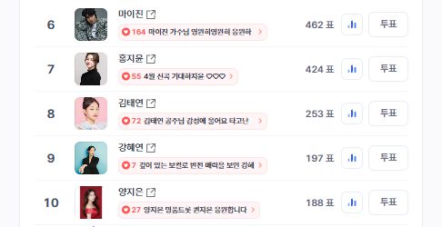 이 같은 활약에 힘입어 마이진은 팬 투표에서도 좋은 반응을 얻었다. 22일 오전 11시 54분 기준, 디시트렌드 '그녀의 노래가 내 마음을 울린다! 1위로 올려야 할 트로트 여자는?' 일간 투표에서 462표를 얻어 6위를 기록했다. 이는 마이진의 꾸준한 성장세와 대중의 기대를 반영하는 결과로 해석된다.