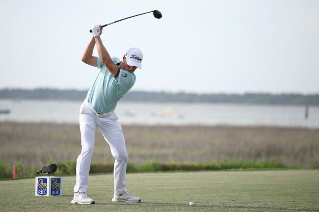 <저스틴 토머스가 PGA 투어 RBC 헤리티지에서 타이틀리스트 드라이버로 티샷을 날리고 있다. /AFP 연합뉴스 |